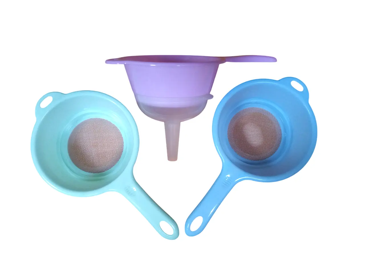 🍵 مصافي مطبخ ملونة + قمع بلاستيكي عملي – لتفريغ بدون فوضى – سهلي حياتك فالتصفية والتحضير!